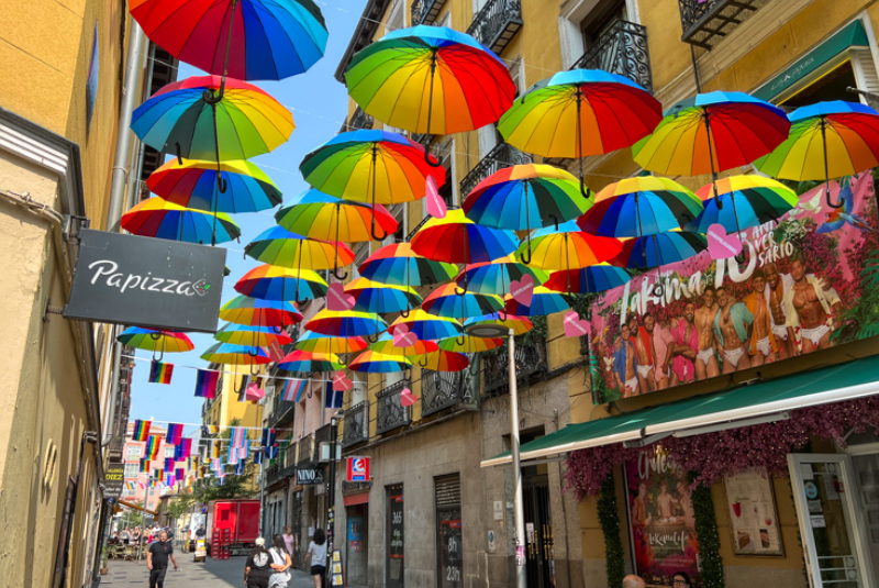 Descrição: Barrio de Chueca é sinônimo de diversidade, estilo e alegria. Antigo bairro tradicional, transformou-se em um dos pontos mais vibrantes e acolhedores de Madrid. Reconhecido mundialmente por sua atmosfera inclusiva e moderna, é o centro da vida noturna e gastronômica da cidade. Suas ruas são repletas de bares elegantes, restaurantes criativos e boutiques de design. Durante o dia, é um local agradável para passear e admirar a arquitetura charmosa; à noite, torna-se palco de festas e celebrações. Chueca é também o epicentro do Orgulho LGBTQ+ de Madrid, considerado um dos maiores do mundo. O bairro simboliza a alma livre e acolhedora da cidade — um espaço onde todos podem ser quem são e celebrar a vida em sua forma mais colorida.