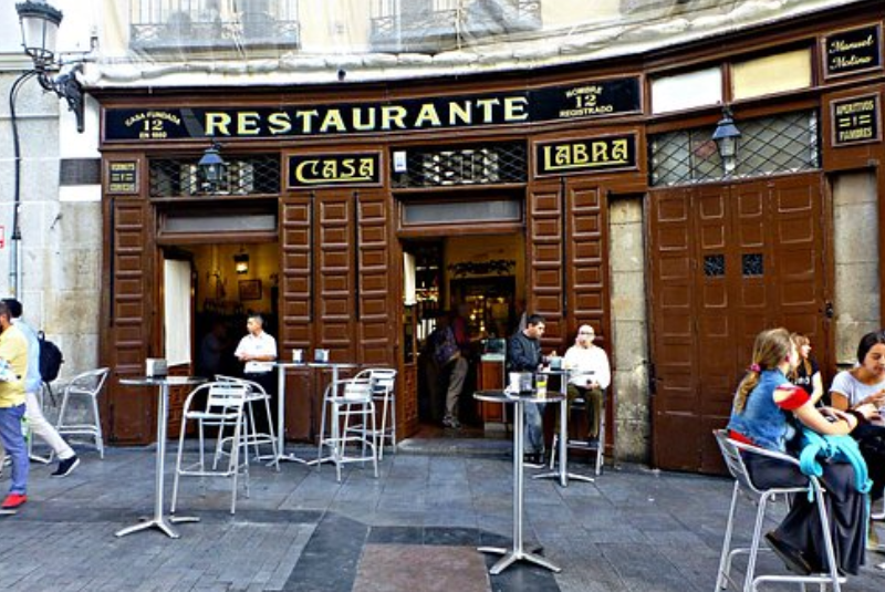 Descrição: Fundada em 1860, a Casa Labra é um ícone da tradição culinária madrilenha. Localizada ao lado da Puerta del Sol, é conhecida por seu famoso bacalao frito e pelas croquetas de bacalao, servidas desde o século XIX. O local conserva o charme original, com balcão de madeira, azulejos antigos e atmosfera típica das tabernas espanholas. É o lugar ideal para saborear tapas acompanhadas de uma taça de vinho ou vermute. Além da gastronomia, a Casa Labra tem valor histórico: foi ali que nasceu o Partido Socialista Operário Espanhol (PSOE), em 1879. Hoje, continua sendo ponto de encontro de madrilenhos e visitantes que buscam autenticidade. Comer na Casa Labra é reviver a história da cidade através do paladar — simples, saboroso e cheio de alma.