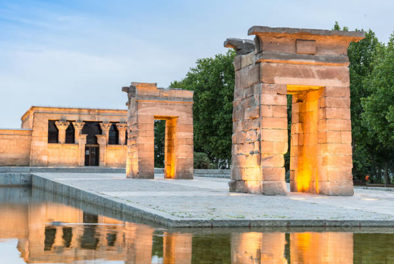Descrição: O Templo de Debod é uma joia do Egito Antigo que encontrou um novo lar em Madrid. Presente do governo egípcio à Espanha, foi reconstruído pedra por pedra no alto do Parque del Oeste. Seu entorno, com jardins e espelhos d’água, oferece uma das vistas mais deslumbrantes do pôr do sol madrilenho. À medida que o sol desce, o templo se ilumina em tons dourados e alaranjados, criando um cenário quase místico. Caminhar por suas colunas é tocar a história de mais de dois mil anos. É um lugar que mistura silêncio, espiritualidade e beleza — um pedaço do deserto egípcio no coração da Espanha. Um dos pontos mais poéticos e contemplativos da cidade.